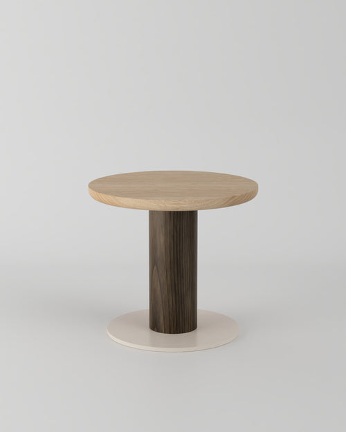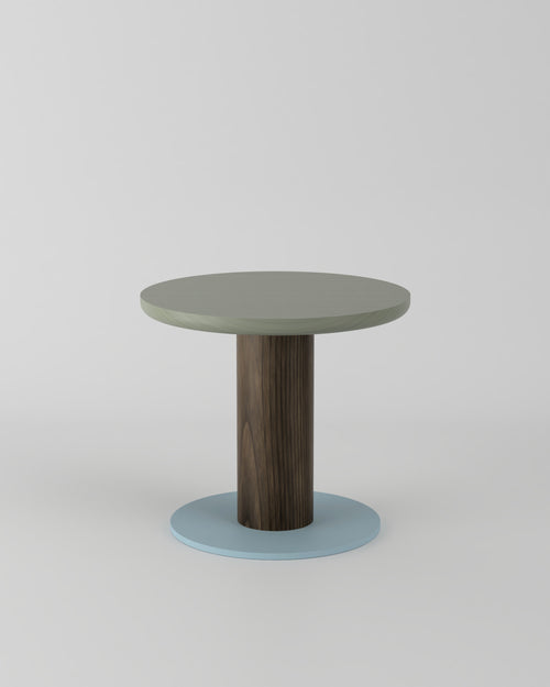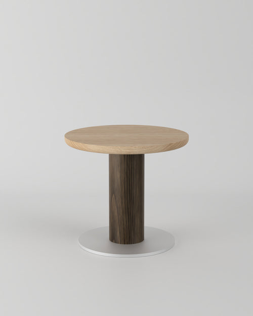 The tabletop is handmade in solid timber, with natural variations that give each piece its own character. The centre is hand-turned, adding weight and form with a sculptural feel. The base is available in brushed aluminium or a durable powder-coated finish, offering a choice between a natural metallic look or blocked colour.